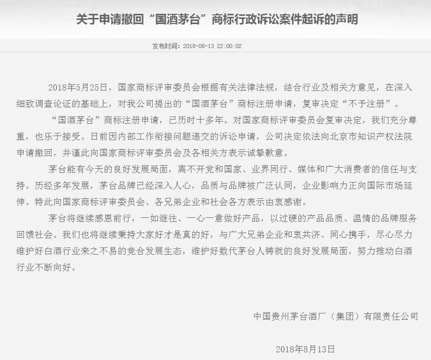 聲明宣布,茅臺集團在聲明中表示,“國酒茅臺”商標注冊申請,已歷時十多年。對國家商標評審委員會復審決定,茅臺集團充分尊重,也樂于接受。日前因內(nèi)部工作銜接問題遞交的訴訟申請,茅臺集團決定依法向北京市知識產(chǎn)權法院申請撤回,并謹此向國家商標評審委員會及各相關方表示誠摯歉意。