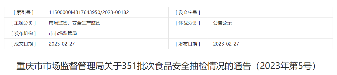面對(duì)食品造假問題,監(jiān)管部門堅(jiān)決“零容忍”查處。近日,從重慶市市場(chǎng)監(jiān)督管理局關(guān)于351批次食品安全抽檢情況的通告(2023年第5號(hào))獲悉,市場(chǎng)監(jiān)管局抽檢餅干、餐飲食品、炒貨食品及堅(jiān)果制品、淀粉及淀粉制品、豆制品、方便食品、糕點(diǎn)、罐頭、酒類、糧食加工品、肉制品、乳制品、食用農(nóng)產(chǎn)品、食用油、油脂及其制品、蔬菜制品、薯類和膨化食品、速凍食品、糖果制品、調(diào)味品、飲料等20類食品351批次樣品。其中合格樣品339批次,不合格樣品12批次。