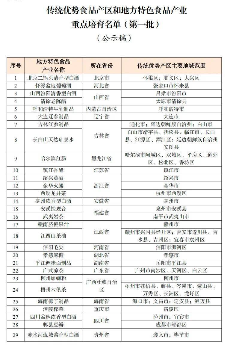 4月23日,工業和信息化部消費品工業司公示首批傳統優勢食品產區和地方特色食品產業重點培育名單,全國共40個產區(產業)入圍。其中,有八省市區、21個市區縣白酒產地入列首批大名單。