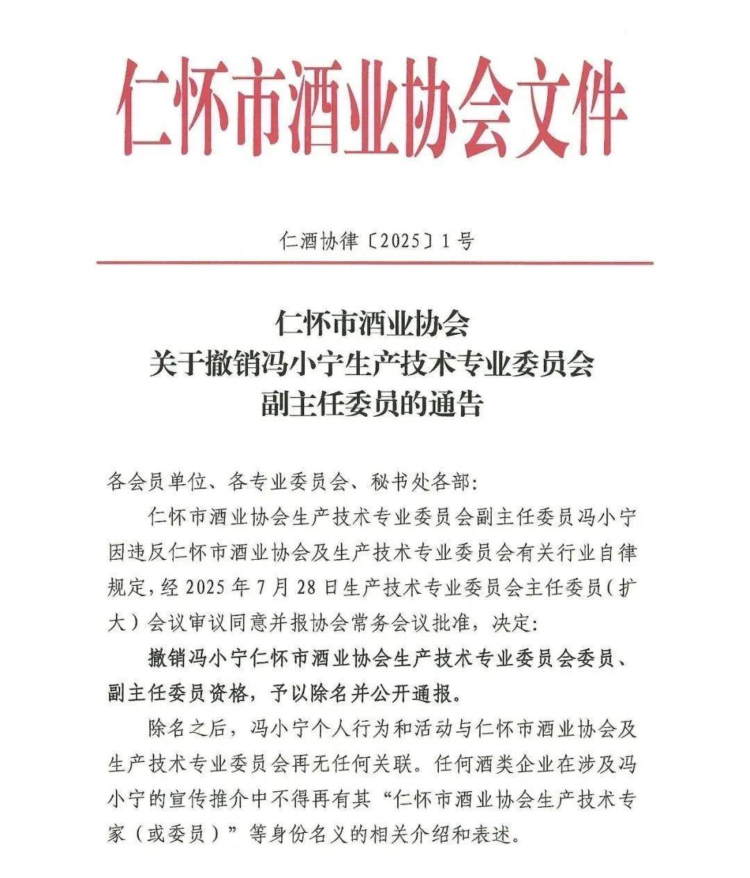 通告中顯示,仁懷市酒業(yè)協(xié)會(huì)生產(chǎn)技術(shù)專業(yè)委員會(huì)副主任委員馮小寧因違反仁懷市酒業(yè)協(xié)會(huì)及生產(chǎn)技術(shù)專業(yè)委員會(huì)有關(guān)行業(yè)自律規(guī)定,經(jīng)2025年7月28日生產(chǎn)技術(shù)專業(yè)委員會(huì)主任委員(擴(kuò)大)會(huì)議審議同意并報(bào)協(xié)會(huì)常務(wù)會(huì)議批準(zhǔn),決定:撤銷馮小寧仁懷市酒業(yè)協(xié)會(huì)生產(chǎn)技術(shù)專業(yè)委員會(huì)委員、副主任委員資格,予以除名并公開通報(bào)。
