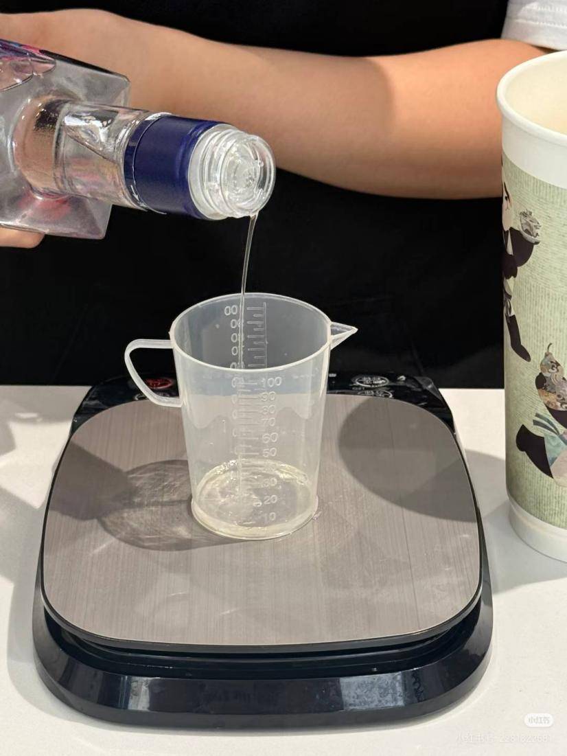 茶百道店員制作“醉步上道”時用量杯取白酒