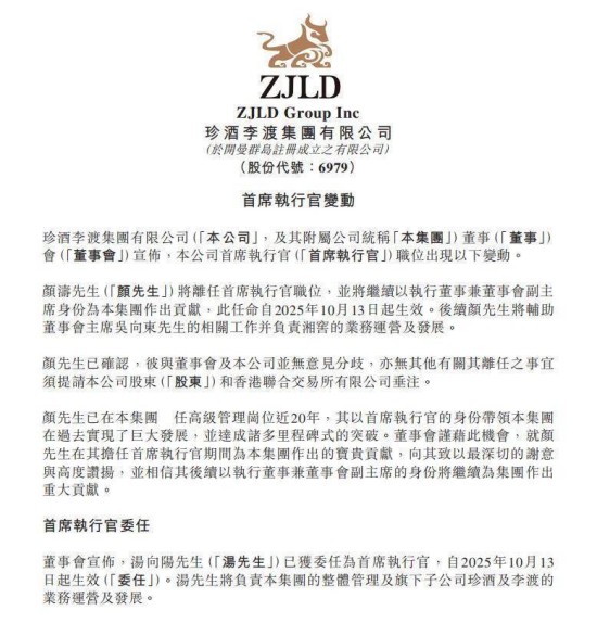 10月13日,珍酒李渡集團(6979.HK)發布高管任命公告:湯向陽任集團首席執行官,顏濤任集團執行董事兼董事會副主席,兩項任命即日生效。
