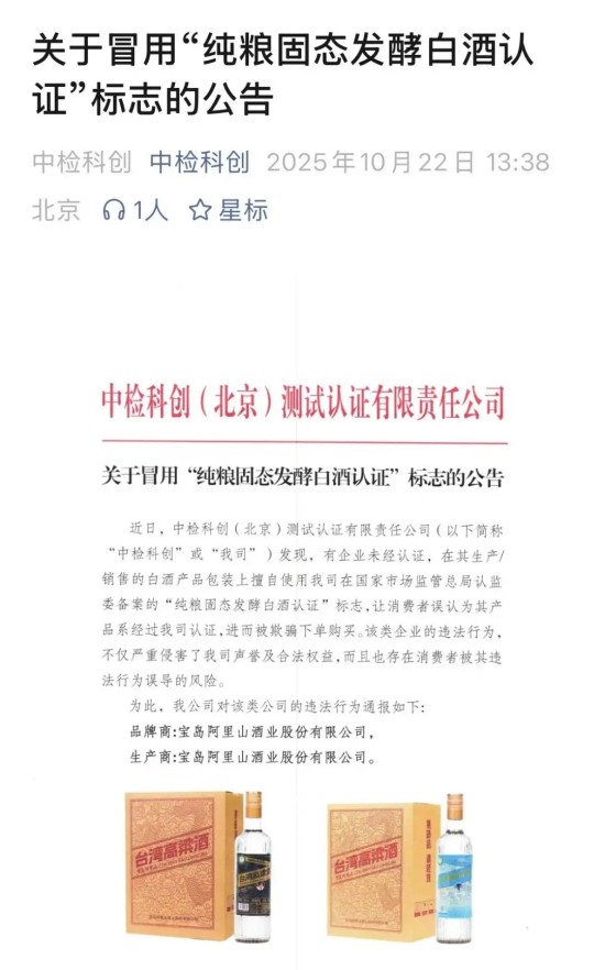 10月22日,中檢科創(北京)測試認證有限責任公司官方發出“關于冒用‘純糧固態發酵白酒認證’標志的公告”。