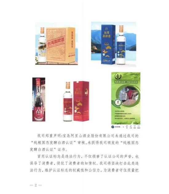 中檢科創(北京)測試認證有限責任公司鄭重聲明:寶島阿里山酒業股份有限公司未通過我司的 “純糧固態發酵白酒認證”審核,未獲得我司頒發的“純糧固態 發酵白酒認證”證書。將對其進行公告,向有關監管部門舉報其侵權行為,并保留通過法律途徑追究其責任的權利。同時,我司也提醒廣大企業和消費者注意防范類似情況的發生。
