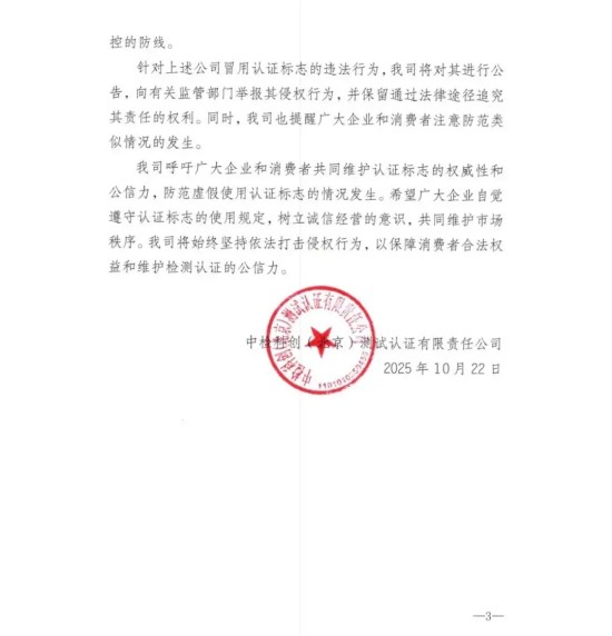 中檢科創(北京)測試認證有限責任公司直接點明這家違法侵權單位: