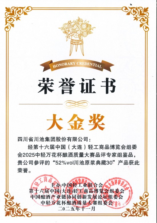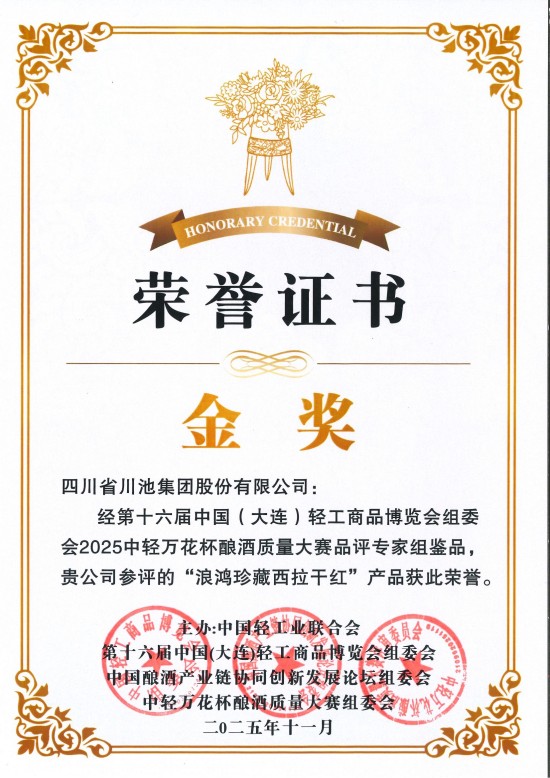 在本屆博覽會首次舉辦的2025中輕萬花杯釀酒質量大賽中,四川省川池集團股份有限公司旗下產品“川池原漿典藏30”“浪鴻珍藏西拉干紅”憑借卓越品質和深厚文化,分別斬獲“大金獎”“金獎”兩大重磅獎項。
